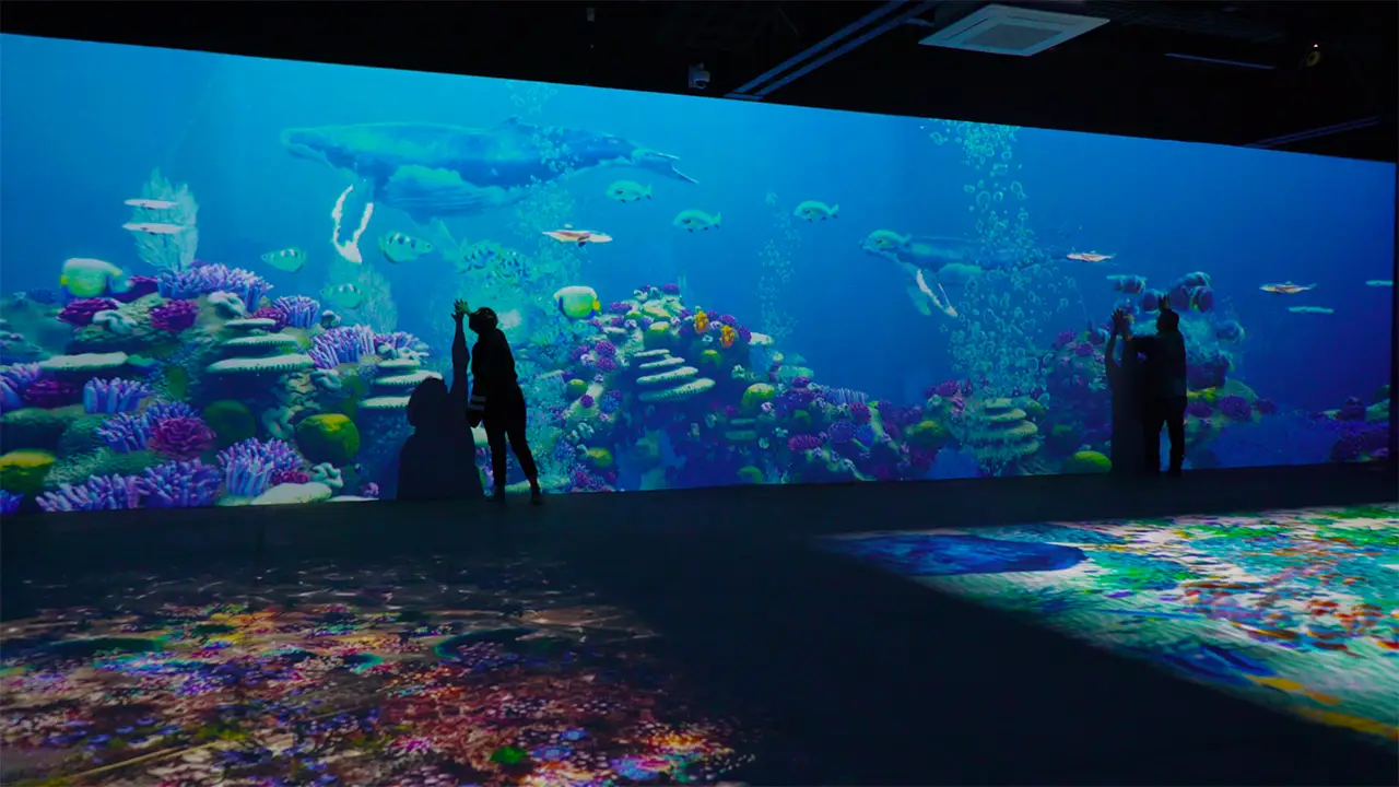 Este espacio combina proyecciones inmersivas, pantallas interactivas y simulaciones que recrean ecosistemas marinos. Dentro de sus 370 m², el visitante encuentra proyecciones de tiburones, medusas, ballenas, tortugas y más especies.