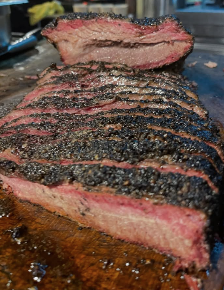 Brisket: El corazón del menú. El corte más difícil. El pecho de la res, un músculo que soporta el peso del animal. “Si lo haces bistec, parece una liga”, bromea Charlie. Por eso aquí se cocina entre 12 y 16 horas, dependiendo del tamaño. Baja temperatura. Humo constante. Sal y pimienta calibradas al milímetro. Resultado: una suavidad que se deshace en la boca. Imposible no pedirlo.