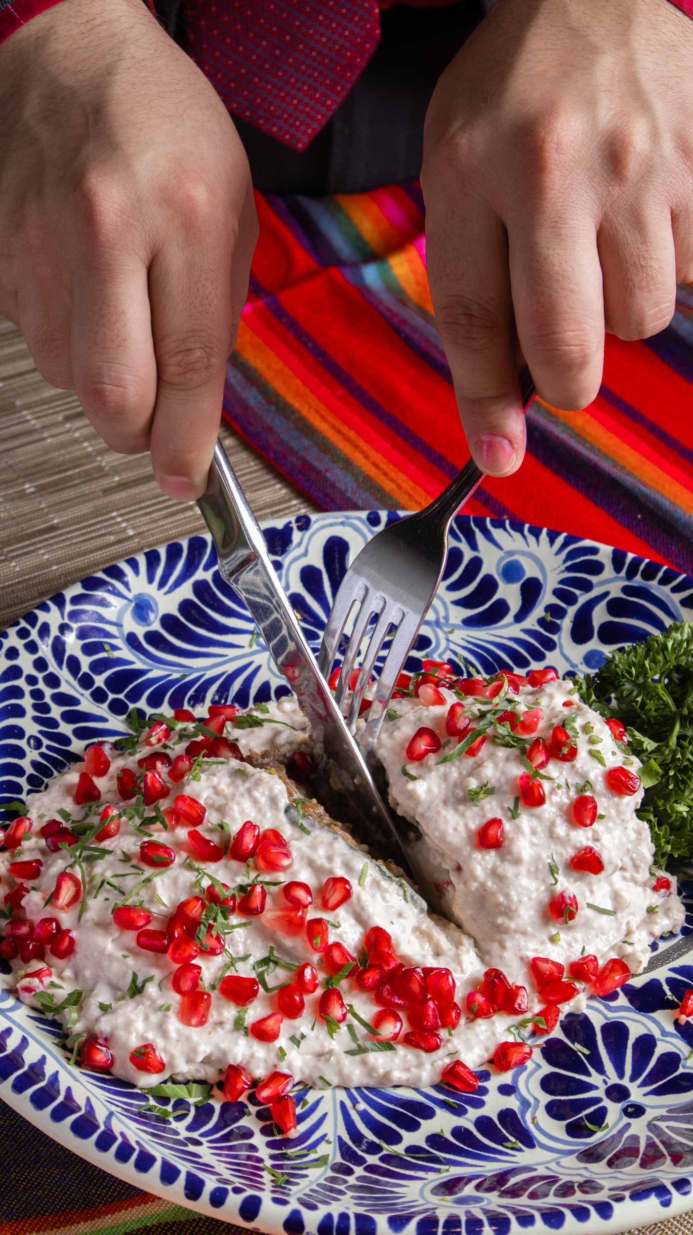 El relleno lleva también frutas, nueces, vino, mezcal y jerez, y está bañado con una nogada de nuez de Castilla elaborada al momento, con ingredientes frescos y de temporada.
