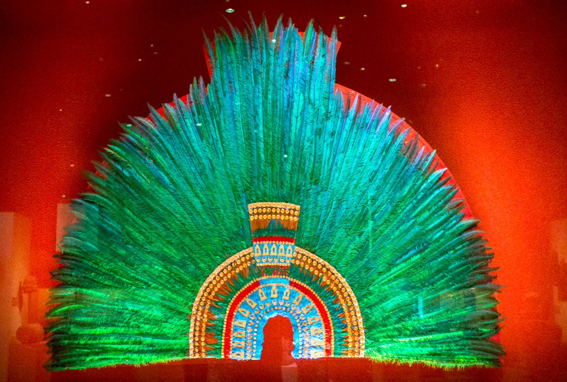El Penacho de Moctezuma, elaborado con plumas de quetzal y oro, se exhibe en el Weltmuseum de Viena. Aunque su origen sigue en debate, representa el esplendor ceremonial mexica.