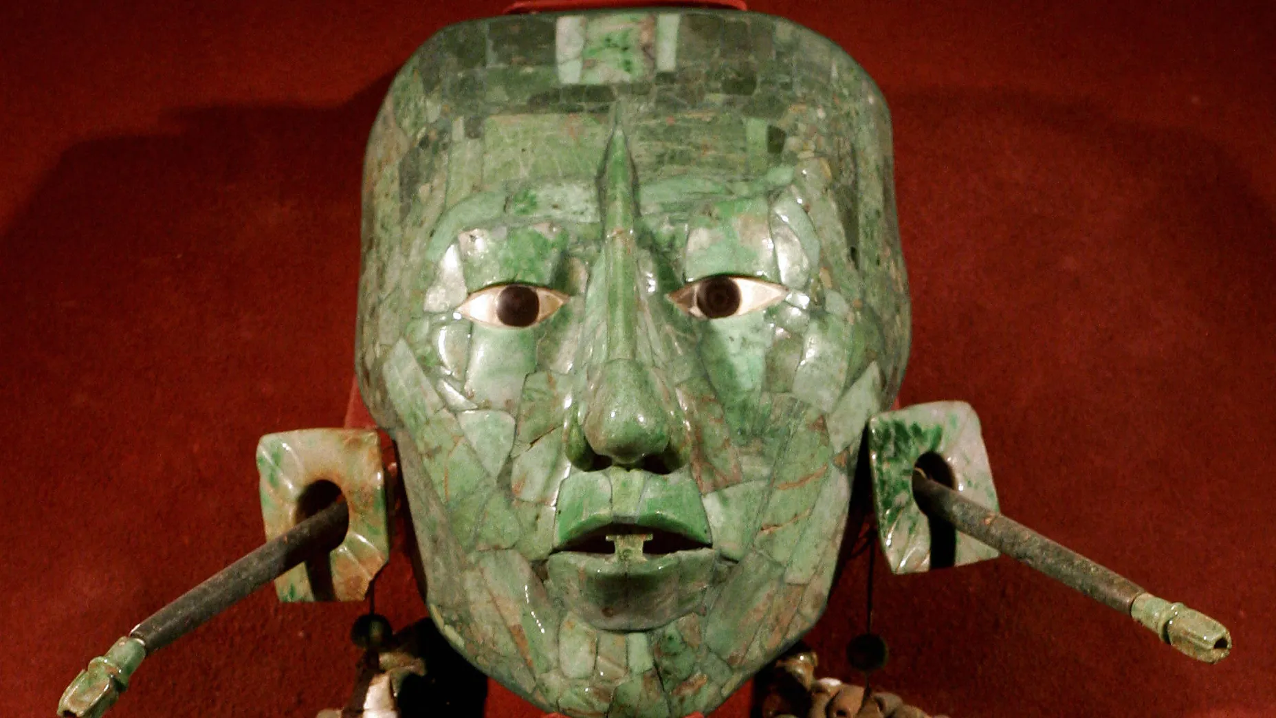 Finalmente, en el Louvre Abu Dhabi, se exhibe una máscara funeraria maya de jade y concha, originaria de Calakmul. Esta pieza conecta el mundo terrenal con el espiritual.