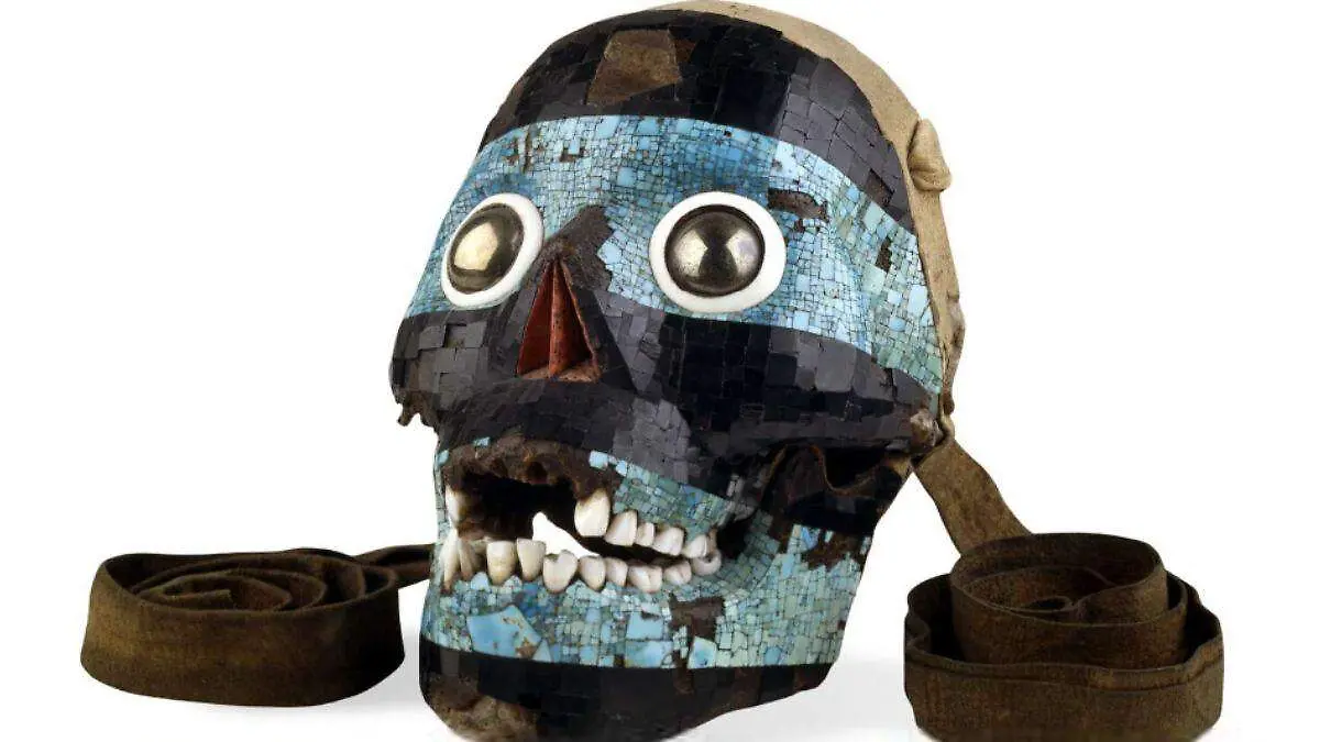 También en Londres, la Máscara de Tezcatlipoca impacta por su intensidad. Hecha con turquesa y obsidiana sobre un cráneo humano, representa al dios de la noche y la hechicería.