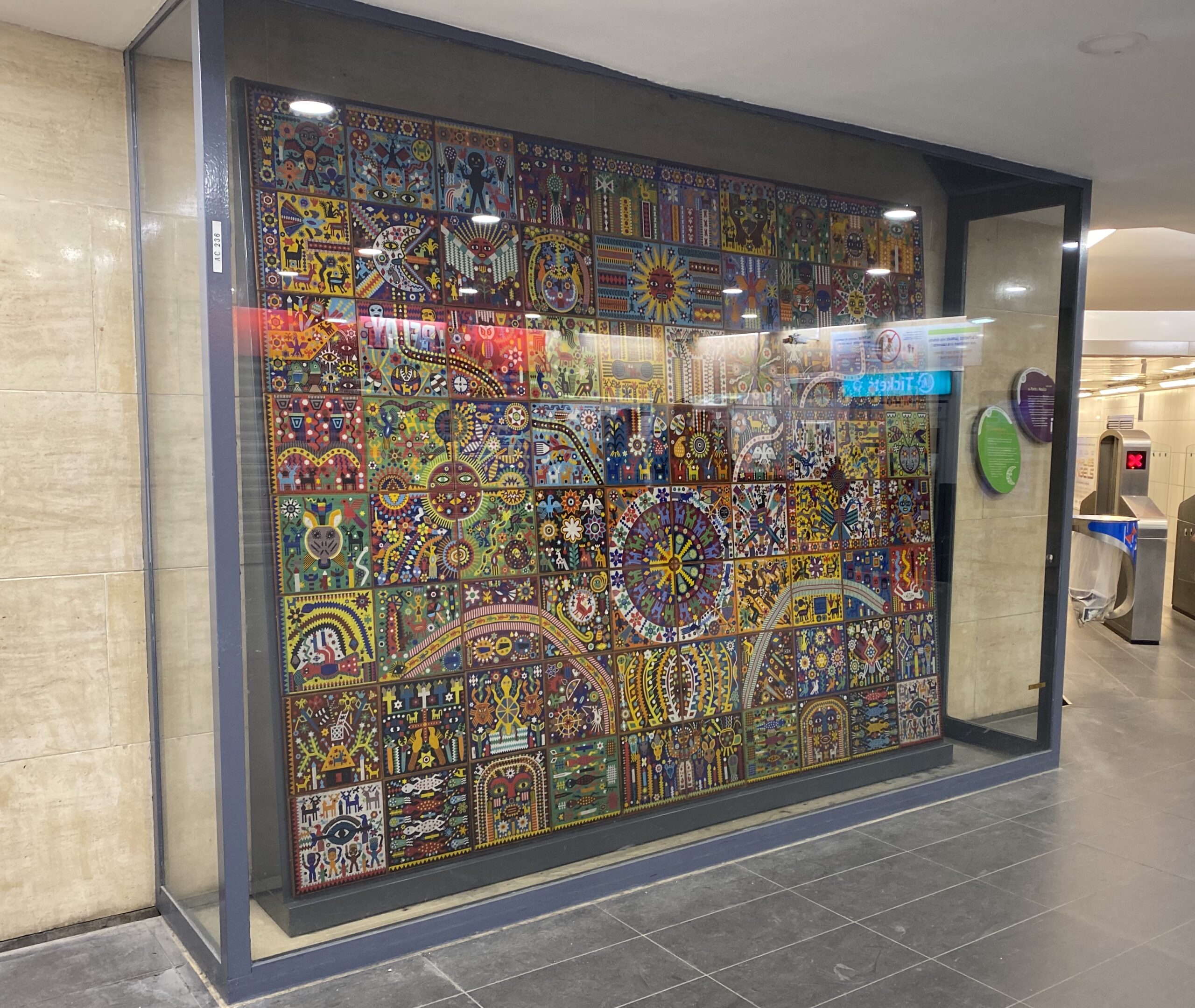 En París, el mural “Pensamiento y alma huichol” decora la estación Palais Royal-Musée du Louvre. Con más de dos millones de chaquiras, esta obra de Santos de la Torre celebra la espiritualidad huichol.