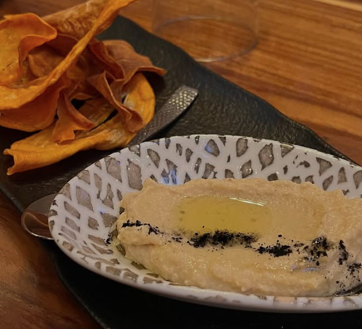 Un hummus de betabel acompañado con chips de camote es perfecto para el inicio de la travesía gastronómica.