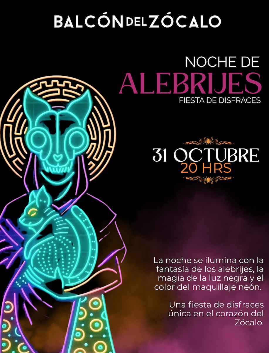 Luces ultravioleta, maquillaje fluorescente, alebrijes vivientes y una energía eléctrica marcarán el tono de la noche. El Balcón del Zócalo invita a los espíritus más creativos a celebrar rodeados de buena música, buena comida y una vista que no necesita presentación.