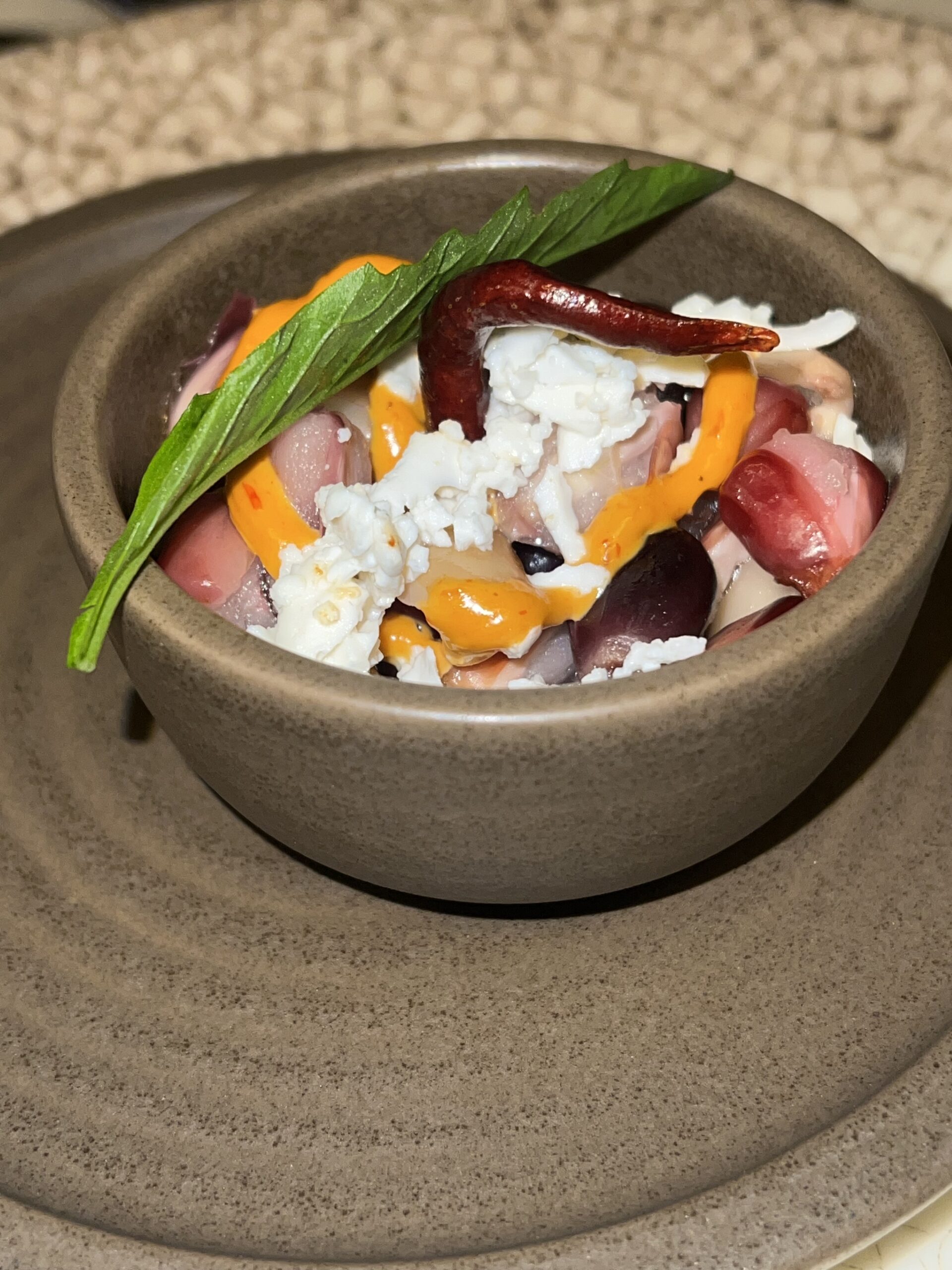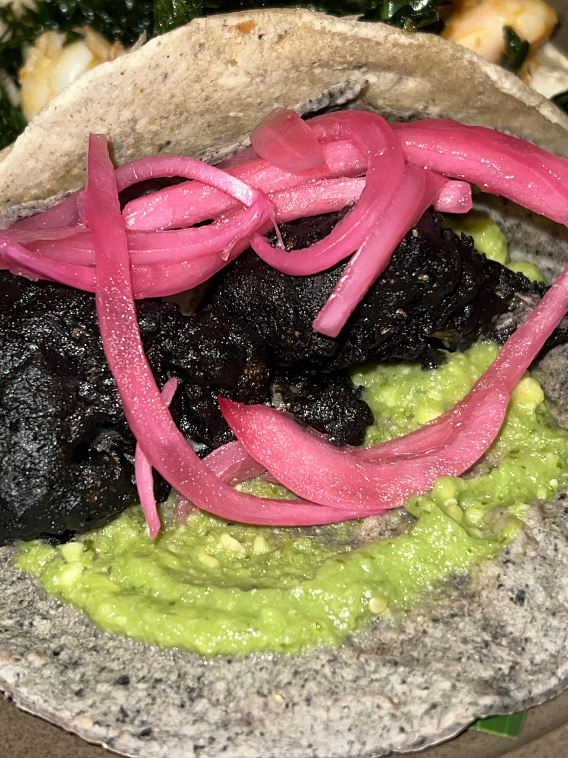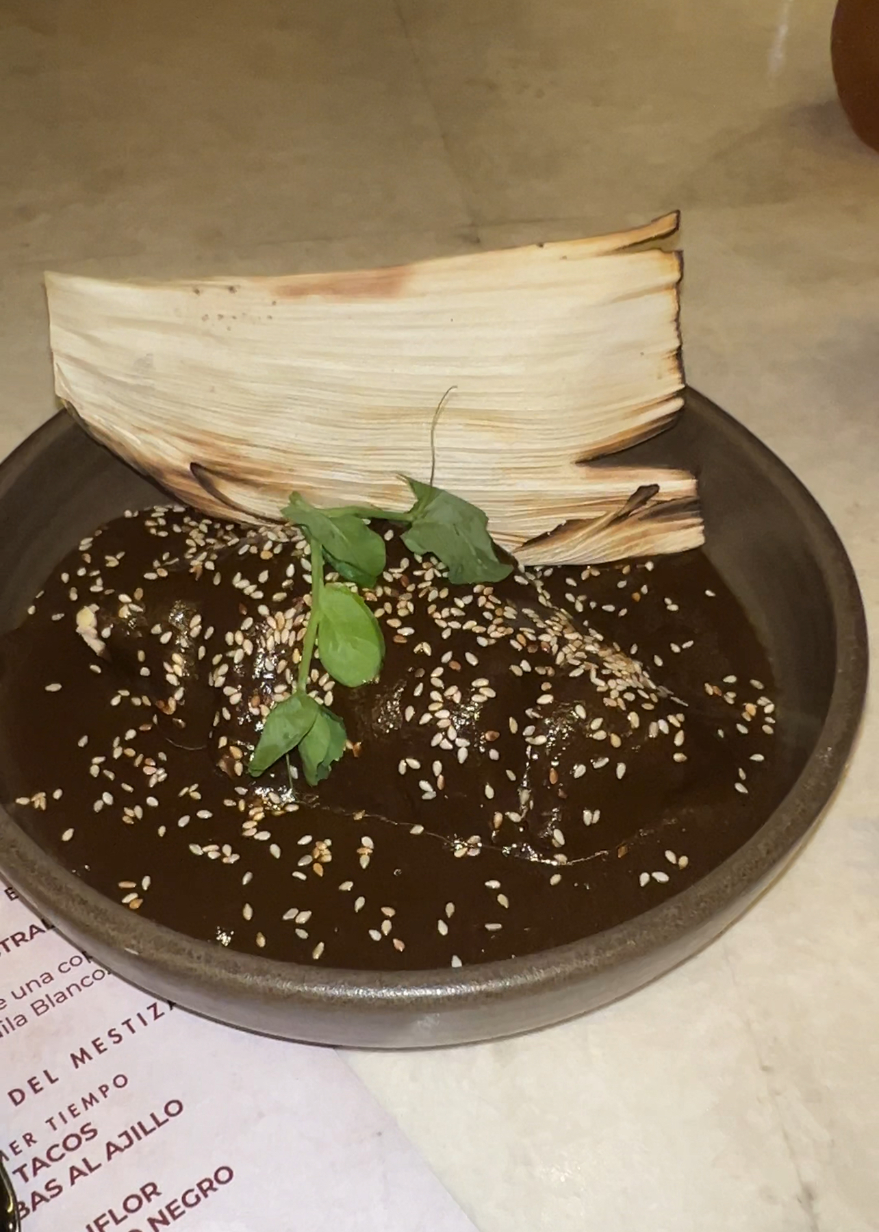 Después, llegaron los tacos de gambas al ajillo y el taco de coliflor con recado negro y cebolla morada encurtida. “Aquí ya sentimos la influencia española, en el ajo y el aceite de oliva, contrastado con el chile guajillo y los frijoles fiesta, elementos profundamente mexicanos”, explicó la chef. Un platillo que resume siglos de fusión cultural en una sola mordida.