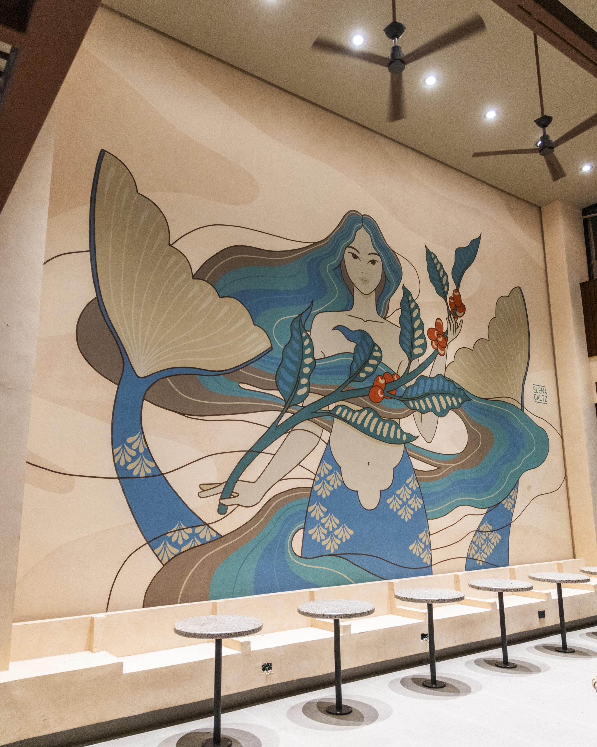 Uno de los mayores atractivos del espacio es la obra de la artista visual Elena Caltz, originaria de Cancún, conocida por sus murales, ilustraciones y cerámicas que exploran la conexión entre cuerpo, espíritu y naturaleza. Su instalación artística, concebida exclusivamente para esta tienda, incorpora materiales nativos y formas orgánicas inspiradas en el entorno local, convirtiéndose en una manifestación tangible de los principios que guían el diseño arquitectónico y artístico de Starbucks.