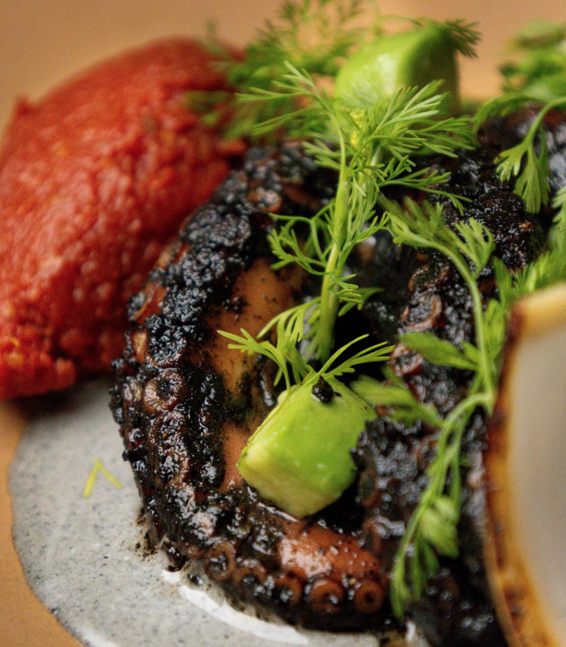 Uno de los platillos más celebrados del menú es el Pulpo Maya, creado por el chef Roberto Solís, cocinado a las brasas con recado negro y servido con salsa ranchera y aguacate. Es un platillo que traduce la tierra al plato: fuego, mar, y sabor.