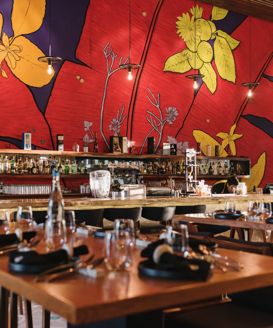 Uno de los puntos más llamativos es el mural detrás de la barra, obra del artista local Gabriel Mendoza, reconocido por colaborar con producciones internacionales como el Cirque du Soleil. El mural integra frutas y elementos representativos de Yucatán: chaya, chile habanero, lima y achiote, en una composición vibrante.
