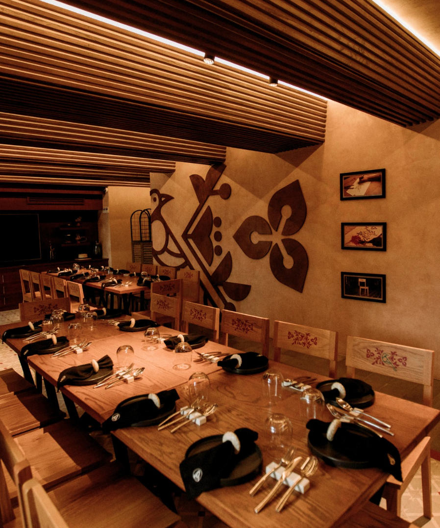 Teya Viva no solo enamora por lo que sirve, también por cómo se siente el espacio. Cada rincón del restaurante está pensado para honrar la herencia de la Hacienda Teya, empezando por objetos traídos desde la hacienda original y un diseño arquitectónico que mezcla tradición y estética contemporánea.